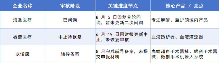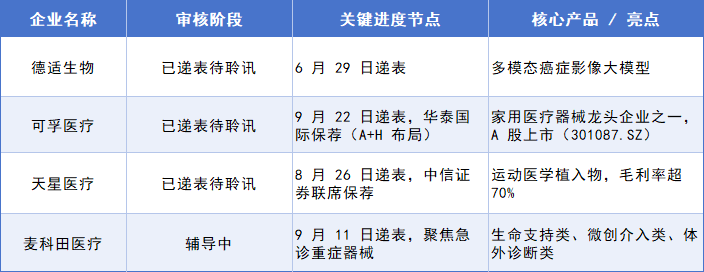 6 月 29 日递表的德适生物,不仅提供 AI 医学影像技术通用平台服务,还以染色体分析为突破口布局智能医疗装备,深耕医学影像 AI 细分领域,已积累技术领先优势、优质客户资源及产品落地先发优势。截至 2025 年 6 月,其产品已进入全国 400 多家医疗机构,覆盖大量三甲医院与诊断中心。不过,港交所 18A 审核周期通常为 3-6 个月,若德适生物能在 10 月前完成首轮问询回复,12 月通过聆讯的概率提高;但仍需应对港股估值压力,不排除延后发行的可能。6 月终止科创板审核后,天星医疗于 8 月 26 日迅速递表港股,其核心产品为运动医学植入耗材(国内市占率前三),毛利率超 70%。港股对械企的商业化要求相对宽松,且同类企业平均审核周期为 4 个月,若能在 11 月前回复问询,年末挂牌存在可能性。9 月 22 日递表的可孚医疗,是已实现盈利的家用器械龙头企业(2024 年营收 29.83 亿元、净利润 3.12 亿元;2025 年前 6 个月营收 14.96 亿元、净利润 1.67 亿元),此次采用双重上市模式。截至 9 月 25 日收盘,其 A 股最新市值为 80.84 亿元。但受递表时间较晚影响,可孚医疗需在 12 月前完成聆讯与发行,节奏极为紧张,预计最快需至 2026 年才能实现港股上市。据彭博社消息,迈瑞医疗(A 股 2018 年上市,代码 300760.SZ)已选定保荐机构筹备港股二次上市,预计募资超 78 亿港元,但截至 9 月 25 日尚未递表。作为行业龙头,迈瑞医疗一旦递表,将成为港股市场的焦点;其港股上市后,有望依托离岸资本加速海外并购与本土化布局,进一步强化全球器械龙头地位。北交所以 “市值 + 营收” 双指标适配中小器械企业,当前在审企业以耗材及设备配套商为主,进度相对平缓:2025 年医疗器械行业中,仅有两家 A 股企业明确推进 “A+H” 双市场布局,聚焦全球化资本运作与业务拓展:对冲刺年末 IPO 的械企而言,审核节奏的不确定性与财务数据的时效性,是两大核心挑战。审核节奏存变数,合规要求高:三类医疗器械企业需通过国家药监局数据核查,例如北芯生命在注册阶段或被要求补充临床随访数据;而思哲睿的案例则显示,注册阶段对商业化逻辑的问询可能显著延长审核周期,成为企业上市的 “拦路虎”。财务数据需 “保鲜”,过期即 “停滞”:科创板与港股均要求招股书财务数据有效期为 6 个月。此前思哲睿就曾因财报过期中止审核;对北芯生命而言,若 10 月后仍未启动发行,需更新 2025 年三季度财报,可能导致上市进程延误。2025 年末国内医疗器械 IPO 末班车的争夺,本质是 “进度确定性” 与 “技术稀缺性” 的双重较量。北芯生命凭借过会 + 注册问询的领先进度,成为年末上市的 “种子选手”;德适生物、天星医疗依托港股审核节奏,构成第二梯队;而思哲睿、同心医疗等企业则受制于审核停滞或进度滞后,大概率错失年末窗口。对企业而言,2025 年末的冲刺结果不仅是融资节点的选择,更折射出创新器械赛道的资本化逻辑 —— 唯有兼顾技术硬实力与商业化能力,才能在审核周期与市场波动中穿越周期,真正实现资本化破局。医疗器械企业在产品注册、上市、融资、落户等关键阶段需专业支持。医疗器械创新网深耕行业,可提供合规梳理、投融资对接、落户规划等解决方案。有需求可扫描二维码加微信,携手助力企业稳健发展。