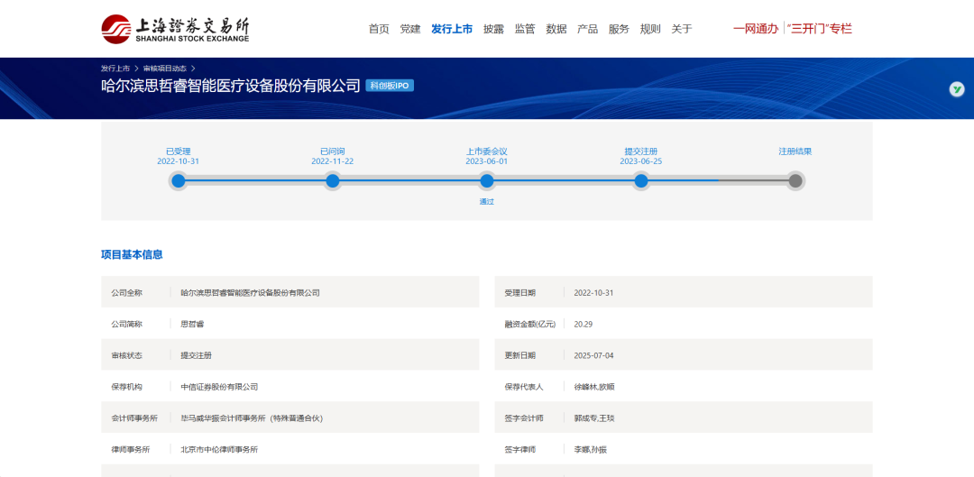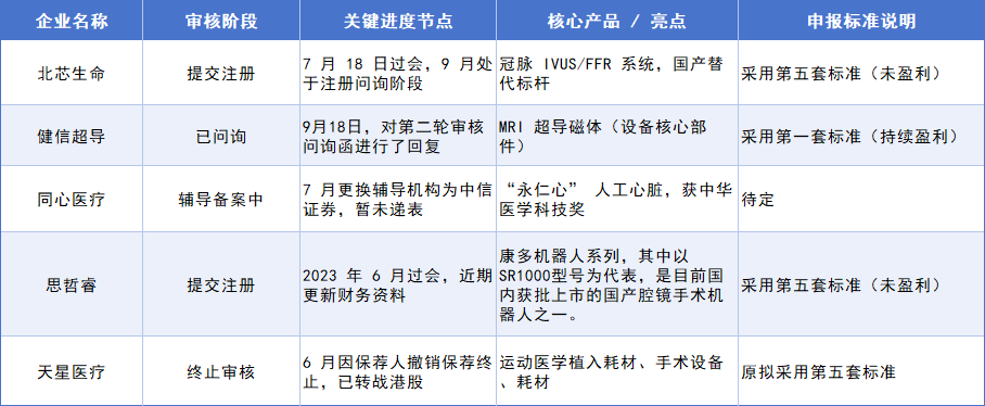 2025 年第四季度将至,国内医疗器械企业的 IPO 冲刺进入关键倒计时。对扎堆冲击资本市场的企业而言,能否在 12 月 31 日前完成挂牌,不仅决定着企业自身的融资节奏,更折射出创新器械赛道的资本化效率。据不完全统计,当前科创板、港股、北交所三大市场共有十余家医疗器械企业推进 IPO中,其中科创板的北芯生命、思哲睿,港股 18A 的德适生物、天星医疗,及 “A+H” 布局的可孚医疗、迈瑞医疗,成为年末窗口的核心竞争者。科创板凭借 “第五套标准”(无需盈利)的政策红利,成为高壁垒创新械企的核心选择。上交所副理事长霍瑞戎在 2025 中国资本市场发展论坛上表示,自重启科创板第五套上市标准以来,科创板已新增受理 15 家企业的 IPO 申请。不过,械企在科创板的 IPO 进度分化显著,头部企业领跑、尾部企业停滞的格局逐渐清晰,具体企业进展如下表所示:在科创板械企分化格局中,仅北芯生命具备年末挂牌的明确条件。作为心血管精准诊疗领域的代表企业,北芯生命 7 月 18 日过会后,9 月已进入证监会注册问询阶段,是目前科创板医疗器械赛道进度最快的企业。根据常规流程,注册生效后 1 个月内可启动发行,若能在 9 月底前获批,其年末完成挂牌的概率极大。尽管思哲睿早在 2023 年 6 月便已过会,但其提交注册申请已逾两年,至今仍未传来获批消息。上交所网站显示,2025 年 7 月 4 日该公司虽更新了财务资料,但招股书注册稿自 2023 年 6 月 25 日后未再更新,公众无法知悉其 2023 年后的财务数据。即便思哲睿已成为哈尔滨 “独角兽” 企业,若 10 月前仍无突破,年末挂牌概率将大幅降低,或成为科创板 “过会未注册” 的典型案例。作为人工心脏领域的龙头企业,同心医疗 7 月将辅导机构更换为中信证券,但截至 9 月 25 日尚未递交申报材料。参考科创板 “受理 - 过会” 平均 5 个月的周期,即便其在 9 月底前完成申报,年末前也仅能推进至问询阶段,2025 年挂牌概率较低,更大概率冲刺 2026 年初窗口。港股 18A 通道虽受估值环境影响,但仍是器械企业全球化布局的重要选项,下半年新增 4 家递表企业,含科创板转道及成熟企业冲刺:德适生物:AI + 影像的 “港股冲刺者”