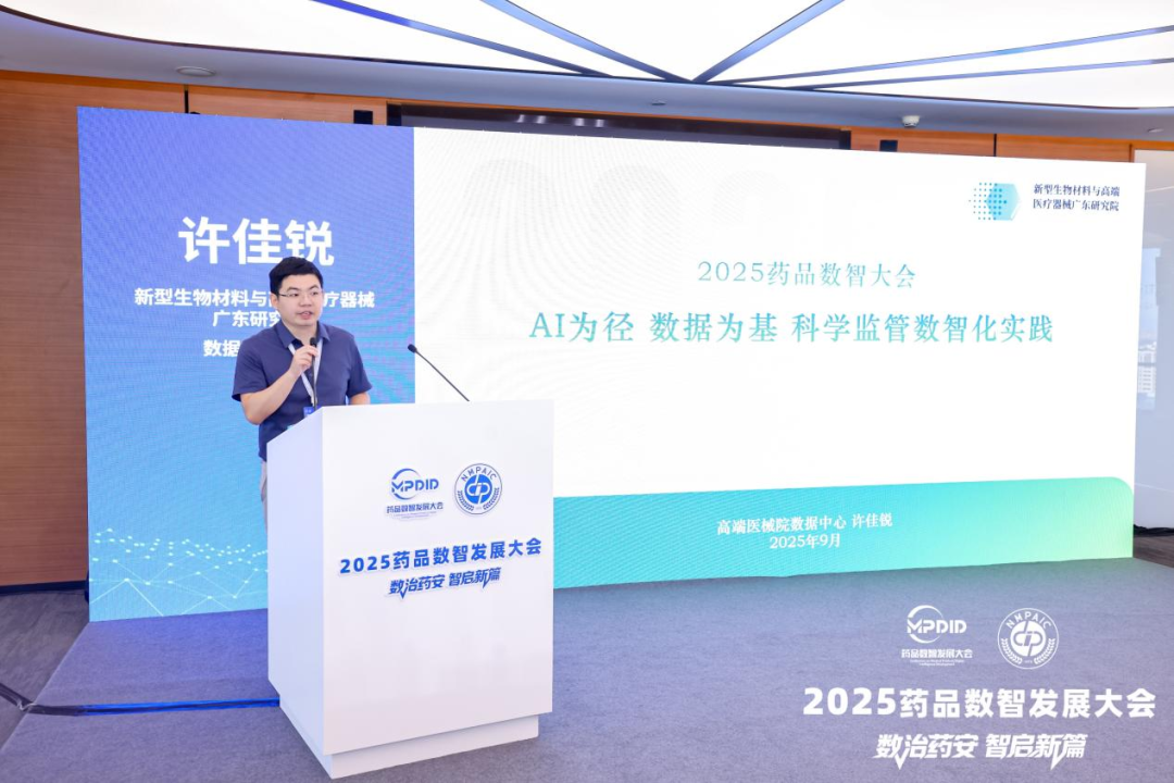 本次大会特设“数智赋能医疗器械全生命周期管理新范式”主题分会,新型生物材料与高端医疗器械广东研究院(简称“高端医械院”)数据中心主任许佳锐受邀出席,并发表《AI为径 数据为基 科学监管数智化实践》主题报告。