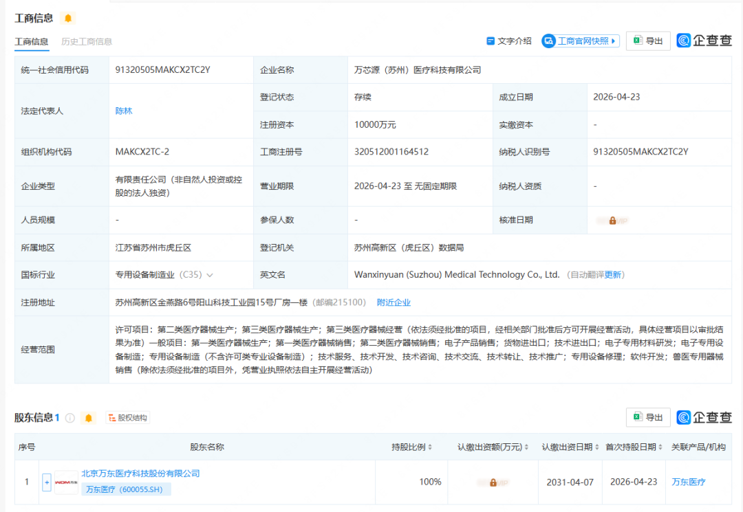 工商信息显示,万芯源(苏州)医疗科技有限公司成立于2026年4月23日,注册于苏州市高新区,注册资本1亿元(实缴未公示),远超行业普通生产企业水平,足见万东布局决心。