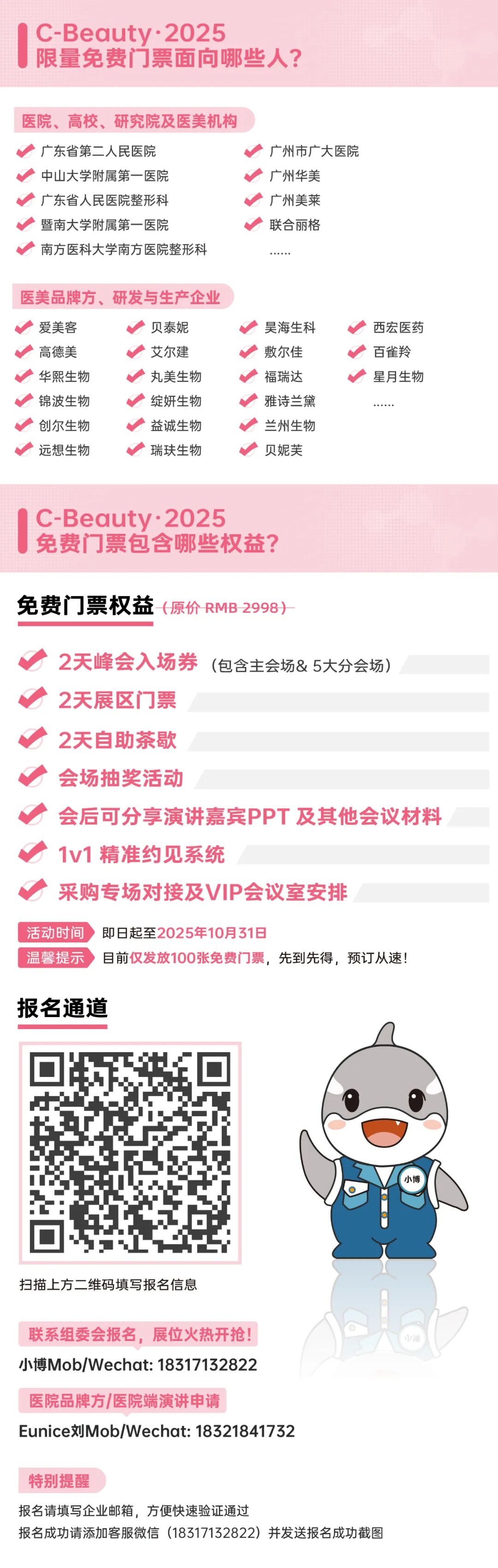 官方正式报名通道已全面开启,针对医美研发与生产企业、研究院与高校代表、医美机构与医院代表,前100名报名者赠送价值2998元参会门票,机会有限,先报先得!