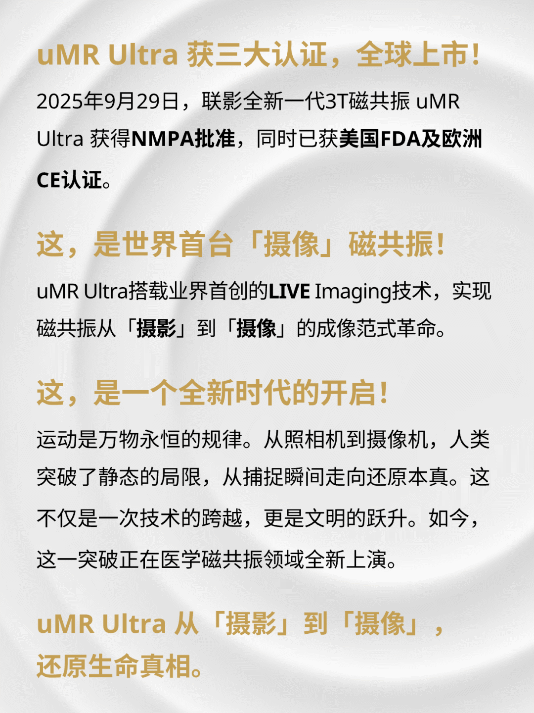2025年9月29日,联影医疗自主研发的世界首台“摄像”磁共振uMR Ultra正式获国家药品监督管理局(NMPA)批准上市。这一成果标志着中国在医疗科技领域取得又一重大突破,联影医疗也因此成为全球唯一掌握“摄像”磁共振技术的企业。目前,uMR Ultra已斩获中国NMPA、美国FDA及欧洲CE三大认证,实现全球上市。