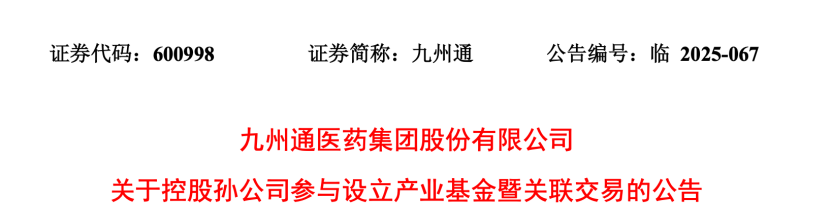 9月23日,九州通发布《九州通医药集团股份有限公司关于控股孙公司参与设立产业基金暨关联交易的公告》。