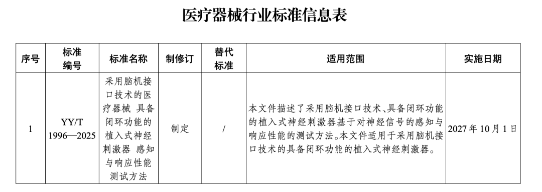 近日,国家药监局发布公告,YY/T 1996—2025《采用脑机接口技术的医疗器械具备闭环功能的植入式神经刺激器感知与响应性能测试方法》医疗器械行业标准已经审定通过,现予以公布。